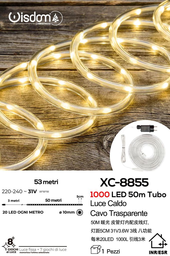 Tubo luminoso 1000 LED luce Calda , 8 giochi di luce, tubo trasparente, 50 mt