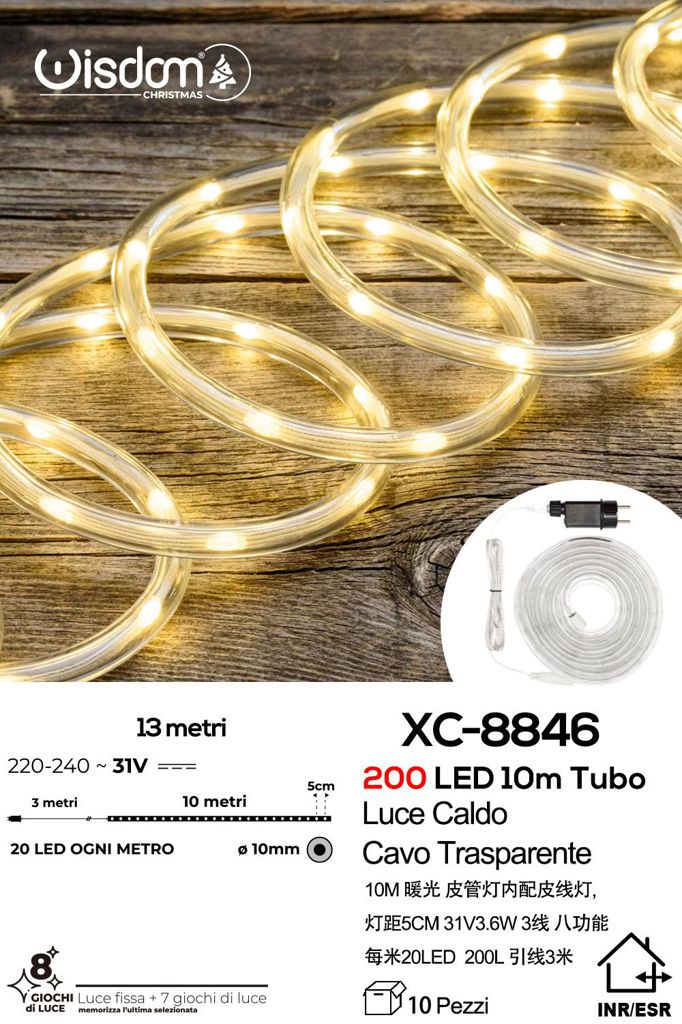 Tubo luminoso 200 LED luce Calda , 8 giochi di luce, cavo trasparente, 10 mt